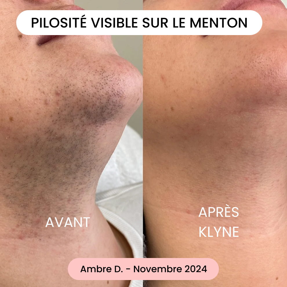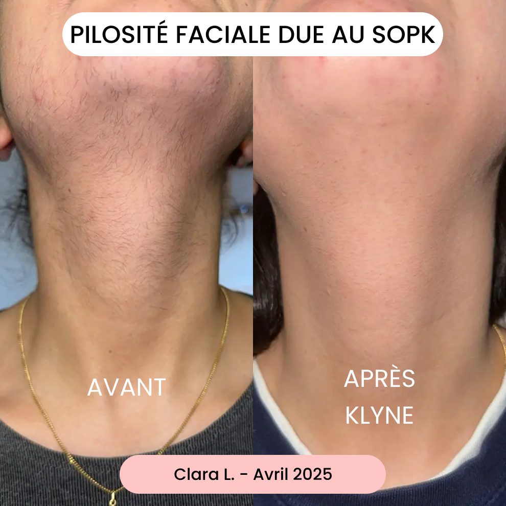 "Je souffre du SOPK et j’ai longtemps galéré avec les poils au menton et au cou. Le laser n’a rien changé, pire, j’avais encore plus de repousses… J’étais désespérée, puis j’ai découvert Klyne. En 1 à 2 mois, mes poils ont presque disparu. Je fais juste une retouche toutes les 1 à 2 semaines. Plus besoin de m’épiler chaque semaine, fini la douleur. Klyne est doux, efficace, et a changé ma vie. Merci 🩷"